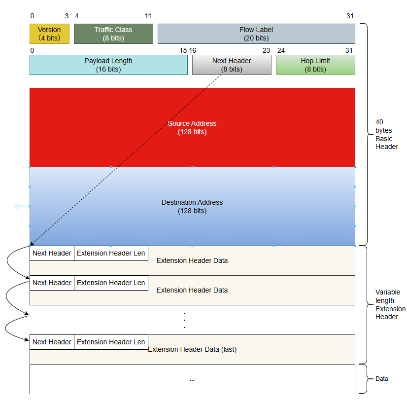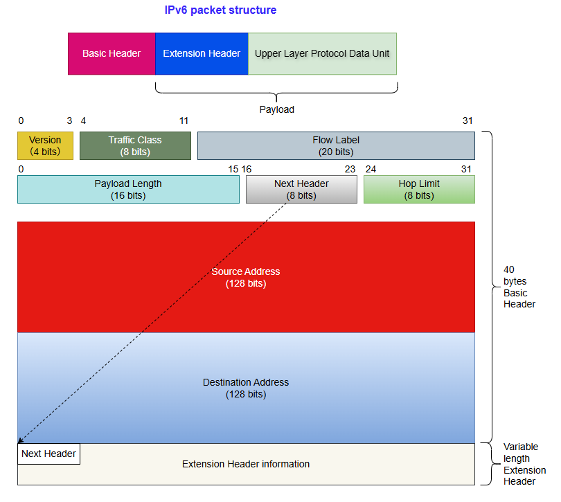 IPv6 - (4 біти, 0110). Доступна кількість IPv6 становить 2128 (як зазначено в полях адрес джерела та призначення в пакетах IPv6). Зокрема, поділено на: